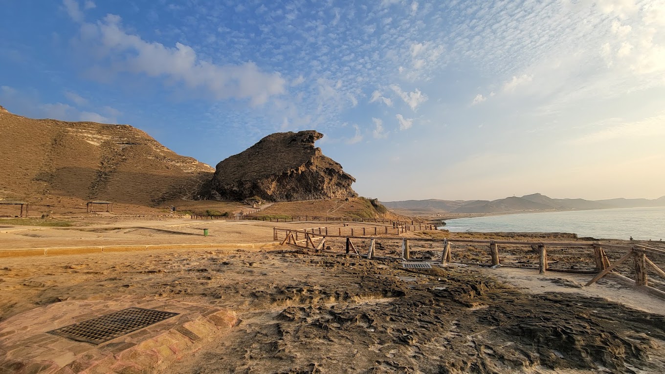 الشاطئ محاط بالجبال الصخرية الشاهقة التي تضفي لمسة ساحرة على المناظر الطبيعية للشاطئ. تعد هذه الجبال مكانًا مثاليًا لمحبي المشي لمسافات طويلة، حيث يمكنهم التمتع بمشاهدة الطبيعة الخضراء والحياة البرية. أيضًا، الشاطئ يقدم فرصة فريدة لممارسة السباحة والغوص حيث يمكن للزوار اكتشاف الحياة البحرية المدهشة والأصداف الملونة.